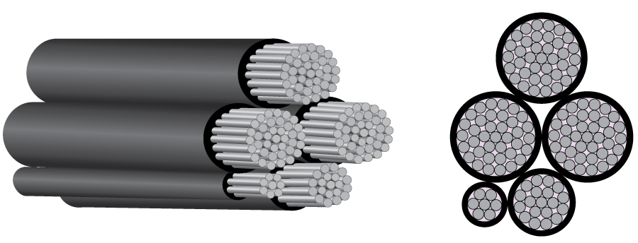 Construction | : | 1. Conductor : a) Phase - The phase conductors shall be aluminium conductor and compacted circular stranded. b) Neutral or messenger - The neutral or messenger conductor shall be of aluminium alloy conductor and compacted circular stranded. c) Street Lighting - The street lighting conductors shall be aluminium conductor and compacted circular stranded. 2. Insulation : The phase, neutral and street lighting conductors shall be extruded with Polyethylene (PE) as insulation. 3. Assembly : The cable consists of insulated phase and street lighting aluminium conductors, shall be held firmly into the insulated neutral messenger aluminium alloy conductor in a right hand (Z) lay. |